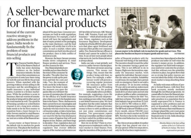 The Financial Stability Report 2025 of the Reserve Bank of India has some damning evidence on the Indian insurance industry. Its data shows that commissions as a proportion of costs have been rising for both life and non-life for the private insurers. When matched with the growing evidence of mis-selling in life insurance and the unwillingness of health insurance to pay individual claims, it points to a broken marketplace. While the problem is acute in insurance, there are worries of unsuitable products being sold in other parts of the retail market as well. The quick fix of banning a product or a distribution channel is not a long-term solution. India needs to be the first country to transition from a buyer-beware to a seller-beware market in retail finance. Only then will the household be a partner and not a victim of the financial sector.