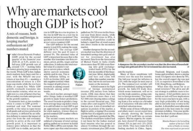 India’s Gross Domestic Product (GDP) print for the second quarter of the financial year 2025-26, at 8.2%, points to a full-year GDP growth rate of around 7.5% — making India the fastest-growing large economy in the world. While GDP is hot, Indian stock markets have been cool for a year, with the Nifty50 one-year return at less than 8% — masking a concentration of return in a few large-cap stocks while the rest have fallen or stayed flat. While GDP growth eventually translates into stock-market returns, what we see right now is a mix of factors that has left secondary markets unimpressed by the growth numbers.